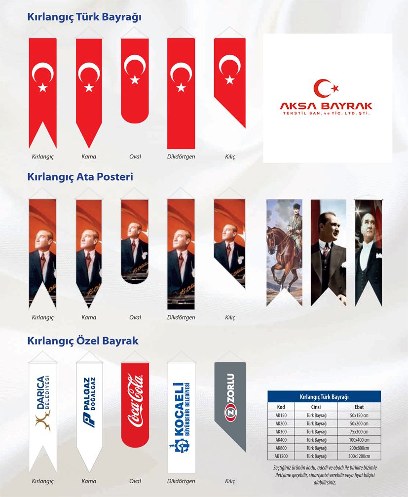 Kristal, parlak saten kumaştan üretilen kırlangıç bayraklar firmaların ve kurumların bilinirlik/görünürlük artırmak için kullanılan en çok tercih edilen flamadır.