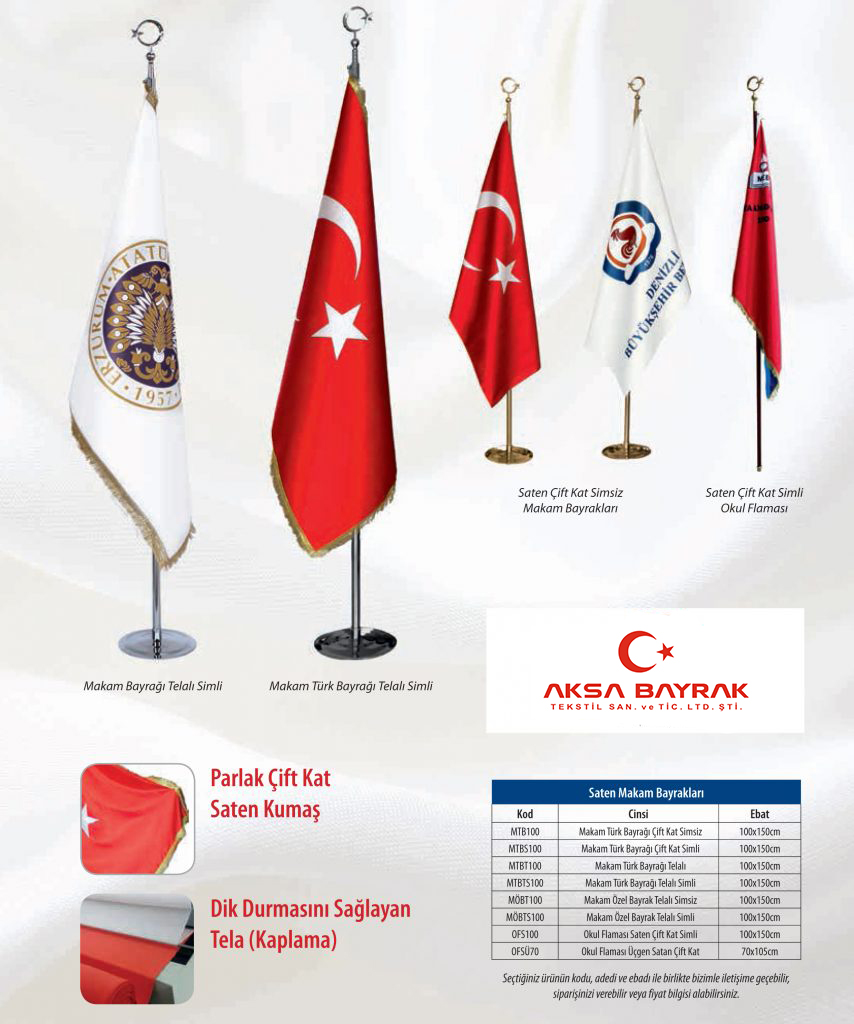 Raşel ve saten kumaştan üretilen gönder direklerine kolaylıkla asılabilen bayrakların en önemli özelliği akma ve solmaya karşı dirençli olması ve güçlendirilmiş köşe dikimleri ve kulpları sayesinde ağır hava şartlarına karşı dayanıklı olmasıdır .