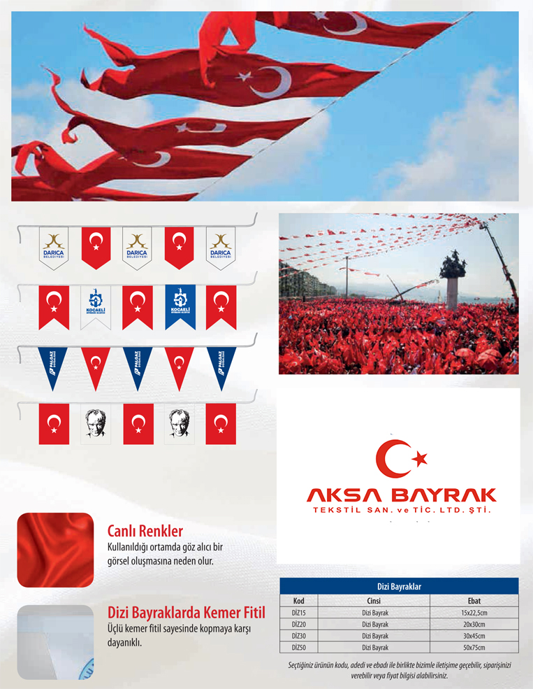 İç ve dış mekanda alpaka ve raşel kumaştan üretilen kopmaya ve ağır hava şartlarına karşı dayanıklı biyeye dizilen bayraklardır. Bina içi ve dışında süsleme yaparken aynı zamanda tanıtım maksadı ile kullanılabilir.